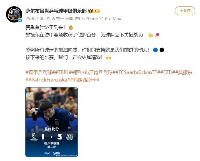 北京时间9月7日凌晨短线配资平台,在德国乒乓球甲级联赛第二轮比赛中,中国选手樊振东独得两分,帮助萨尔布吕肯以总比分3-1战胜巴特克尼格斯霍芬,取得新赛季首场胜利。萨尔布吕肯俱乐部也在微博发文,与中国球迷一同庆祝。